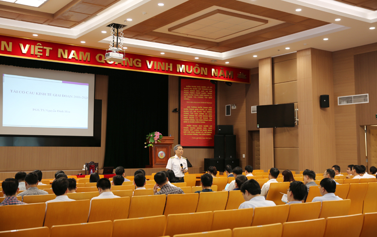Ngay sau lễ khai giảng, PGS. TS. Nguyễn Đình Hòa, Quyền Giám đốc Trường Đào tạo và Bồi dưỡng nghiệp vụ kiểm toán đã trao đổi với các học viên về Chuyên đề “Cơ cấu lại nền kinh tế giai đoạn 2016 – 2020 và những vấn đề đặt ra đối với KTNN”; TS. Phạm Đình Cường, chuyên gia của Bộ Tài chính có bài giảng về Chuyên đề “Cơ cấu lại ngân sách Nhà nước”.