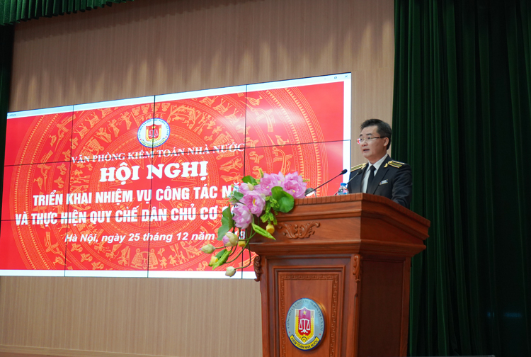 (sav.gov.vn) - Sáng 25/12/2018, tại trụ sở Kiểm toán nhà nước (KTNN) - 116 Nguyễn Chánh, Hà Nội, Văn phòng KTNN tổ chức Hội nghị triển khai chương trình công tác năm 2019 và thực hiện Quy chế dân chủ cơ sở năm 2018. Phó Tổng Kiểm toán nhà nước Nguyễn Quang Thành dự và phát biểu chỉ đạo Hội nghị.