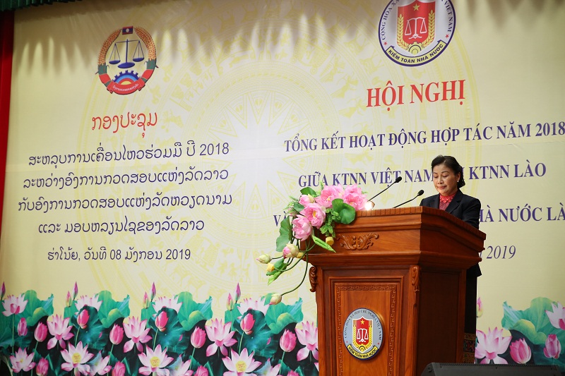 Phát biểu tại Hội nghị, Chủ tịch KTNN Lào bày tỏ sự vui mừng nhận được sự ủy quyền của Chính phủ Lào dẫn đầu Đoàn sang thăm và làm việc tại KTNN Việt Nam, nhằm đánh giá, tổng kết hoạt động hợp tác giữa hai Cơ quan năm 2018 và trao tặng Huân chương cao quý nhất của Đảng, Nhà nước Lào cho các đồng chí Lãnh đạo, nguyên là Lãnh đạo của KTNN Việt Nam. Điểm lại các dấu mốc quan trọng trong quá trình hợp tác giữa hai Cơ quan kiểm toán, Chủ tịch KTNN Lào khẳng định: Trong hơn 20 năm qua, đặc biệt từ tháng 11/2000, khi KTNN Việt Nam và KTNN Lào ký Thỏa thuận hợp tác, KTNN Lào luôn nhận được sự hỗ trợ, giúp đỡ chí nghĩa, chí tình của các đồng chí Lãnh đạo KTNN Việt Nam cũng như các chuyên gia, cán bộ, công chức của KTNN; góp phần tăng cường mối quan hệ hữu nghị truyền thống, tình đoàn kết đặc biệt, sự hợp tác toàn diện giữa hai dân tộc anh em Việt-Lào; đồng thời giúp cơ quan KTNN Lào dần lớn mạnh và trưởng thành như ngày hôm nay.
