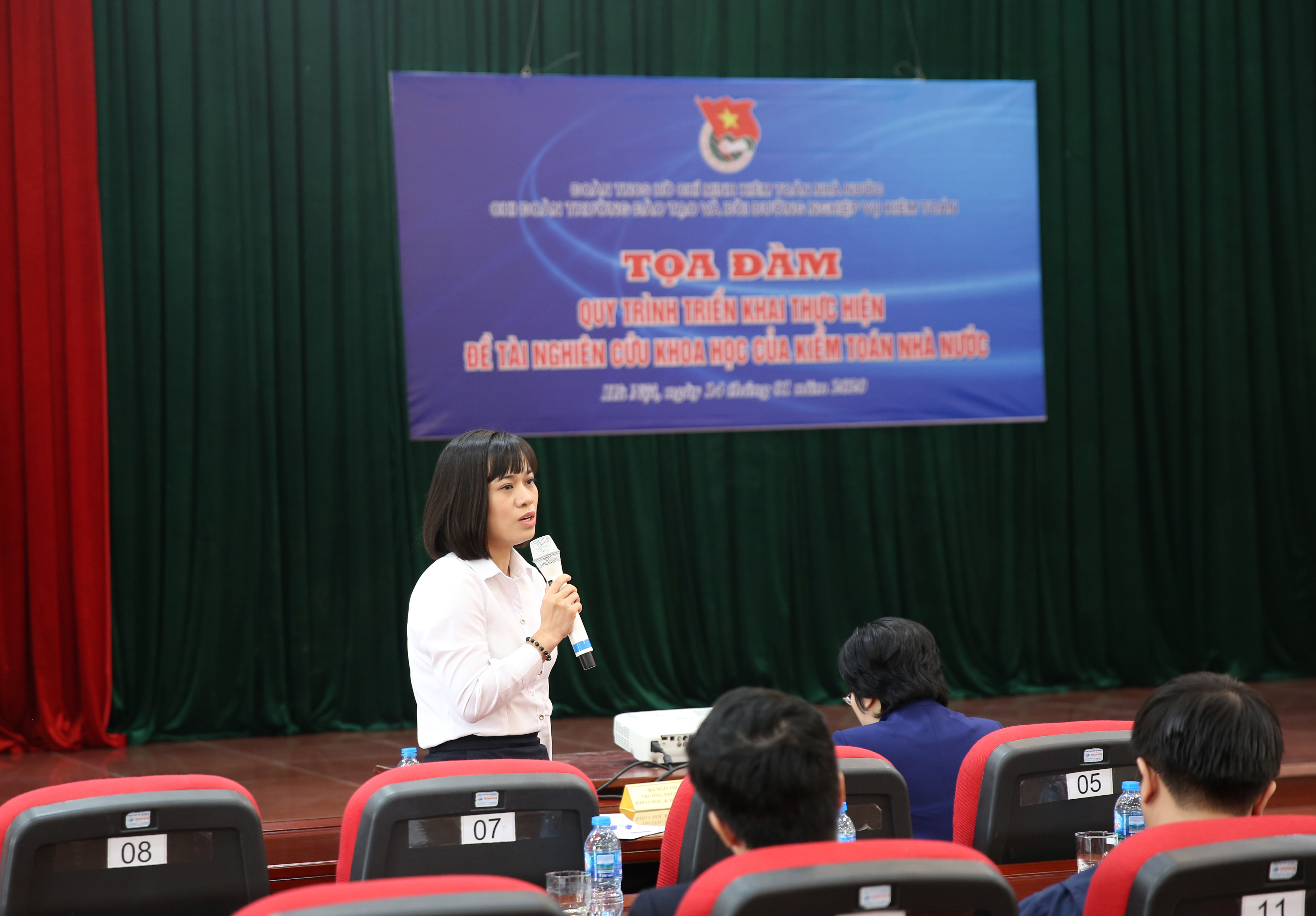 Tại buổi tọa đàm, bà Ngô Thu Thủy - Trưởng phòng Quản lý khoa học và Hợp tác quốc tế của Trường đã giới thiệu các bước triển khai đề tài nghiên cứu khoa học cấp Bộ và cấp Cơ sở của KTNN; PGS.TS Lê Huy Trọng chia sẻ kinh nghiệm lập đề cương và xây dựng thuyết minh chi tiết đề tài nghiên cứu khoa học cấp Bộ và cấp cơ sở của KTNN. Các đoàn viên cũng được nghe những kinh nghiệm quý báu của TS Lê Đình Thăng trong việc đăng ký và triển khai có kết quả đề tài nghiên cứu khoa học, từ cách lựa chọn chủ đề, xác định mục tiêu, tổ chức thực hiện đến cách xây dựng bố cục trong các chương của đề tài…