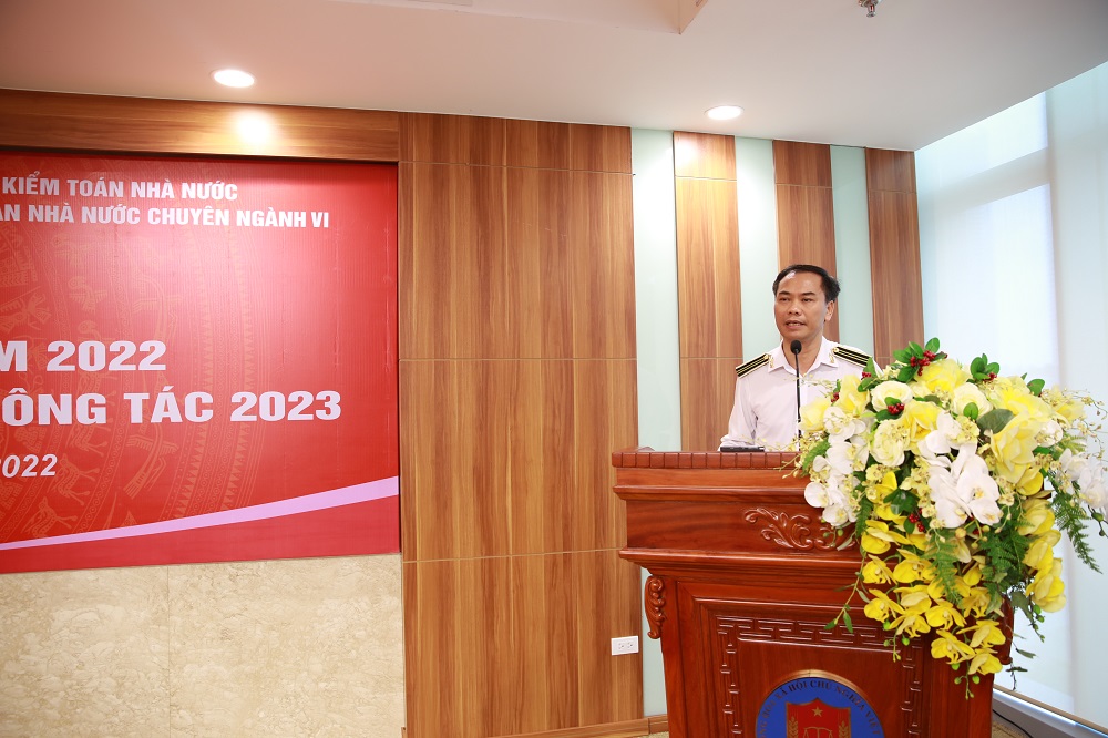 Báo cáo kết quả công tác năm 2022, Kiểm toán trưởng KTNN chuyên ngành VI Trần Văn Hảo cho biết, trong năm qua, đơn vị đã bám sát chỉ đạo của Lãnh đạo KTNN, triển khai đồng bộ các giải pháp với tinh thần trách nhiệm, quyết tâm cao, hoàn thành toàn diện nhiệm vụ chính trị được giao, trong đó trọng tâm là nhiệm vụ kiểm toán đảm bảo chất lượng, tiến độ.