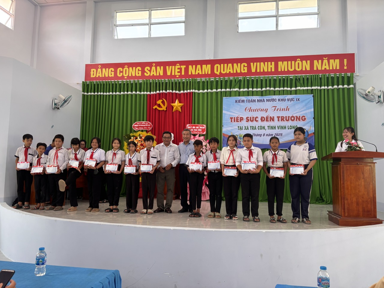 Đại diện KTNN khu vực IX, ông Nguyễn Quang Hồi - Phó Kiểm toán trưởng bày tỏ sự trân trọng và cảm ơn Lãnh đạo tỉnh Vĩnh Long, Ban Lãnh đạo xã Trà Côn đã hỗ trợ, kết nối và tạo điều kiện để Chi đoàn KTNN khu vực IX thực hiện chương trình; Phó Kiểm toán trưởng đã ân cần thăm hỏi sức khỏe, động viên các em học sinh không ngừng nỗ lực, vươn lên để trở thành con ngoan, trò giỏi, những công dân có ích; Ông cũng yêu cầu Ban Chấp hành Chi đoàn KTNN khu vực IX tiếp tục đẩy mạnh hơn nữa phong trào đồng hành với các em - nhất là các em có hoàn cảnh khó khăn, các em thuộc gia đình chính sách, gia đình có công cách mạng trong học tập, cuộc sống, chăm lo thế hệ trẻ.