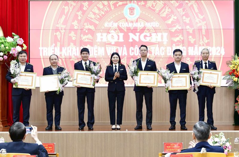 Phó Tổng Kiểm toán nhà nước Hà Thị Mỹ Dung trao Bằng khen của Tổng Kiểm toán nhà nước cho các cuộc kiểm toán được xếp loại xuất sắc và cuộc kiểm toán có thành tích đột xuất xuất sắc trong thực hiện nhiệm vụ kiểm toám năm 2023