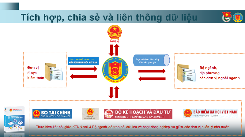 Bên cạnh đó, triển khai Chiến lược phát triển và Kiến trúc tổng thể CNTT của KTNN giai đoạn 2019-2025, tầm nhìn đến năm 2030. Trung tâm tin học đã hoàn thành và đưa vào hoạt động dự án “Xây dựng nền tảng tích hợp, kết nối liên thông dữ liệu của KTNN với các hệ thống thông tin, cơ sở dữ liệu đơn vị được kiểm toán”. Dự án bước đầu triển khai kết nối trao đổi dữ liệu với hệ thống của Bảo hiểm xã hội Việt Nam, Bộ Tài chính, Bộ Kế hoạch và Đầu tư và Ngân hàng nhà nước.