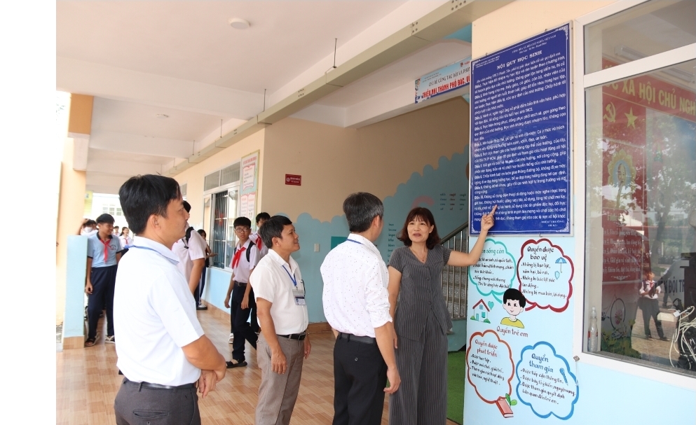 Giám sát việc niêm yết quy định cấm hút thuốc tại trường học THCS Phước Tân, xã Hồ Tràm, TP. Hồ Chí Minh. Ảnh: HCDC