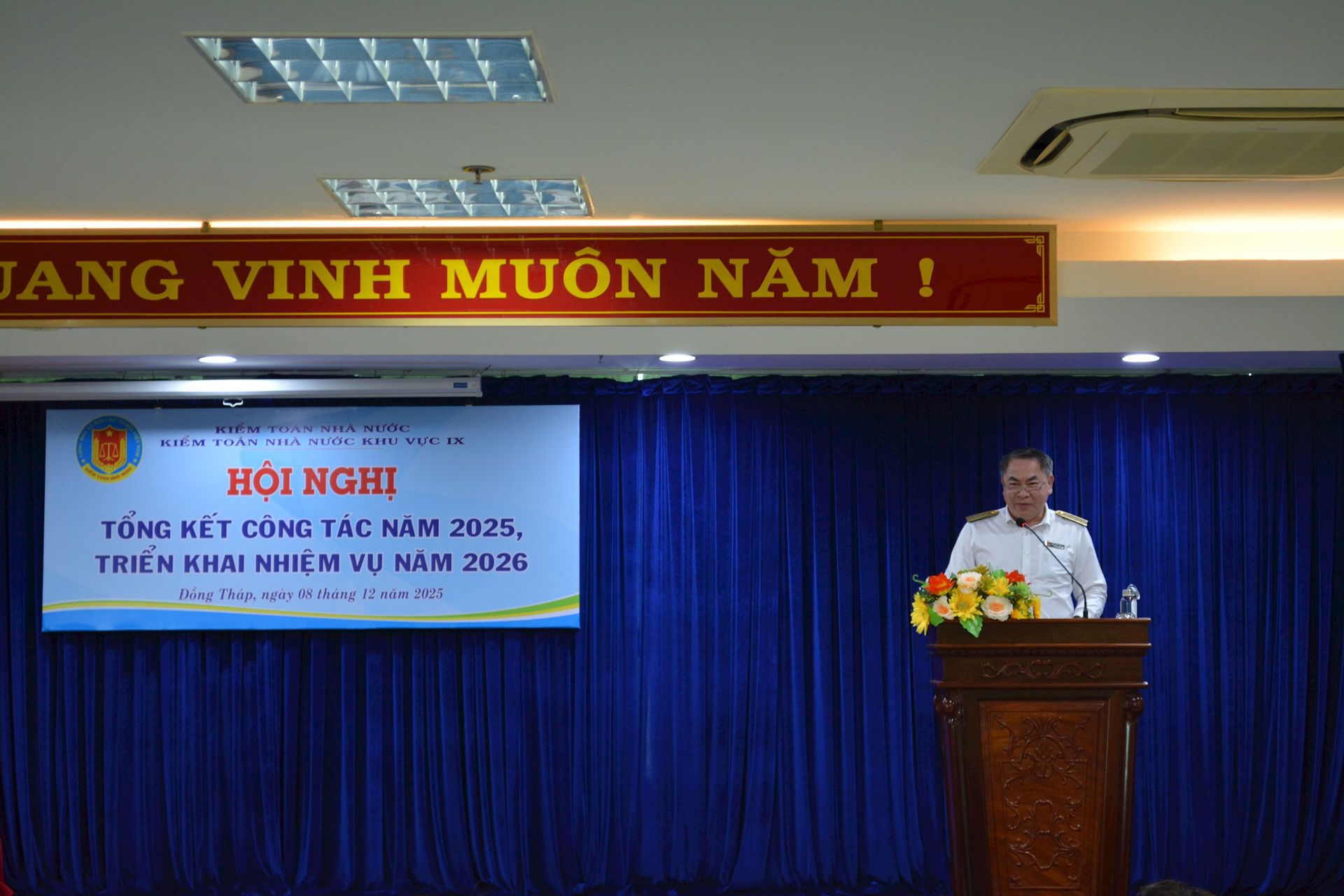 (sav.gov.vn) - Sáng 08/12, tại trụ sở Kiểm toán nhà nước (KTNN) khu vực IX, tỉnh Đồng Tháp, KTNN khu vực IX đã tổ chức Hội nghị Tổng kết công tác năm 2025 và triển khai nhiệm vụ công tác năm 2026. Phó Tổng Kiểm toán nhà nước Trần Minh Khương dự và phát biểu chỉ đạo Hội nghị.